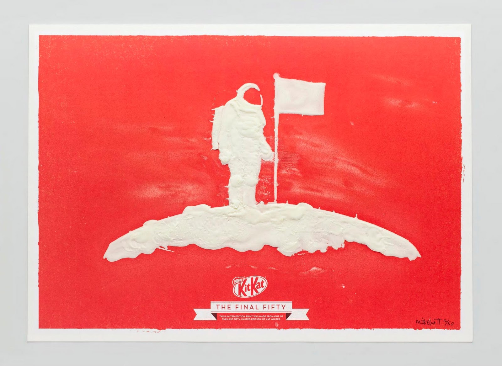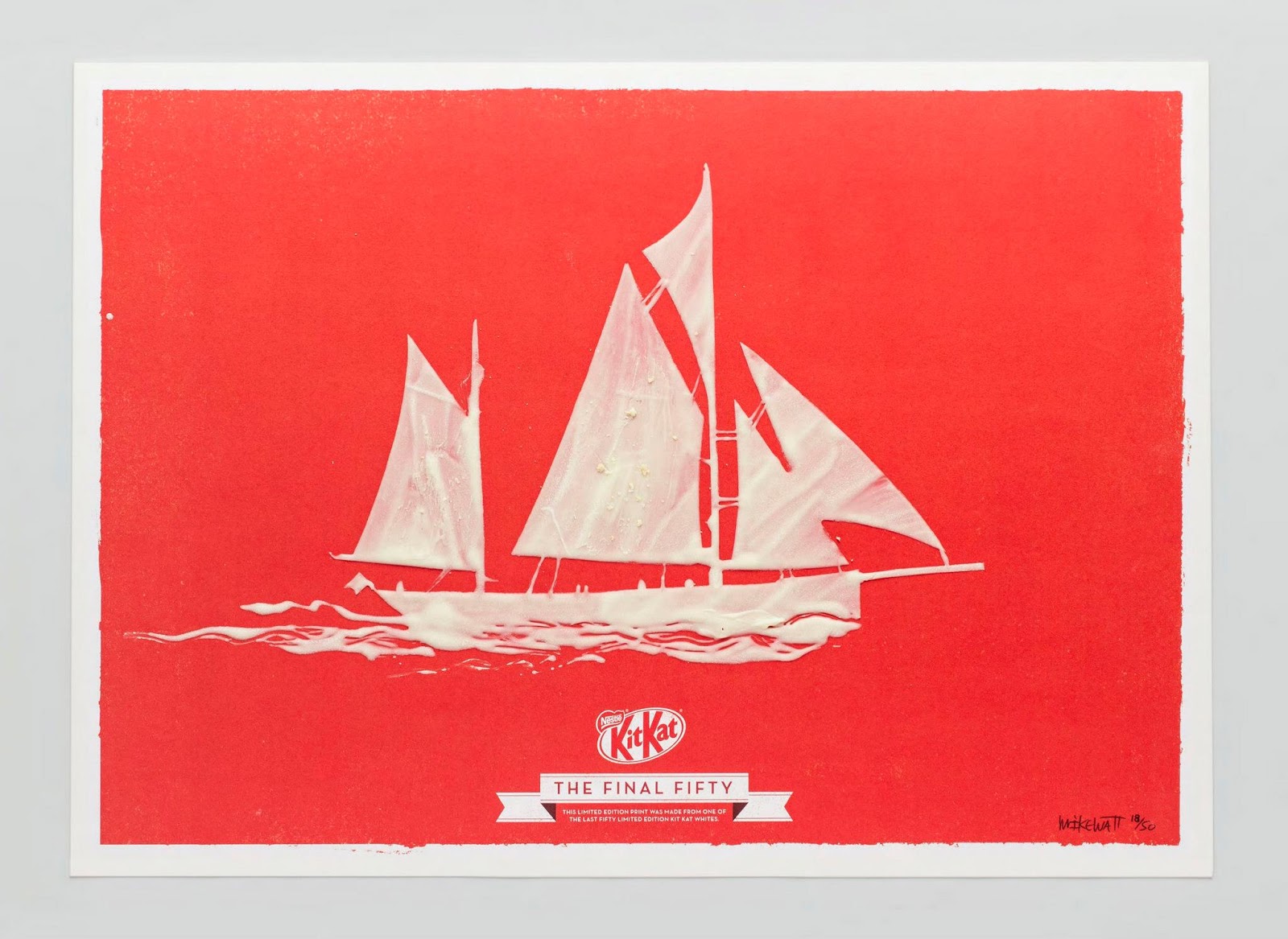 L’artiste Mike Watt a réalisé une série d’affiches publicitaires à la main en utilisant du chocolat blanc fondu.