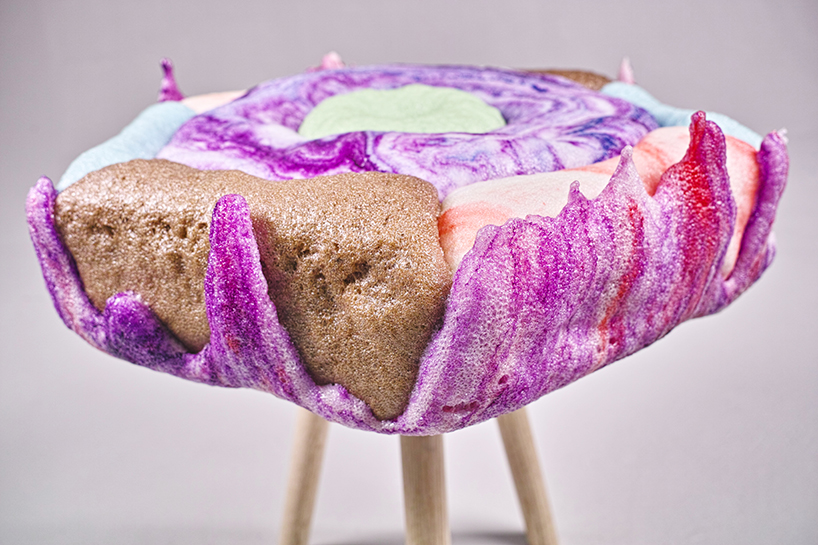 Dès la première vue, cette série de meuble design ressemble à une pièce de bonbon. Ainsi, le designer a crée un assortiment de fauteuil et tabouret de grignoter. Vue son expérience dans la conception graphique, Jojo Chuang a eu l’idée de transformer les outils graphiques en forme. Pour réaliser le premier prototype de sa série Hard Candy, l’artiste utilise des colorants et un agent moussant souple pour imiter le mouvement d’écoulement des pigments. Vue la nature des matériaux, chaque pièce de meuble est totalement unique en son genre.